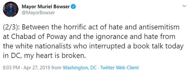 The Mayor of Washington, D.C., Muriel Bowser, tied the protest to a synagogue shooting.