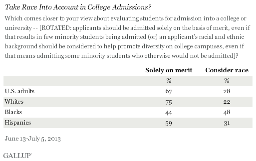 Even though Americans largely reject the idea of using race as a factor in college admissions, they still support affirmative action programs more generally. A separate question in the poll finds 58% of Americans saying they favor “affirmative action programs for racial minorities,” including 51% of whites, 76% of blacks, and 69% of Hispanics.