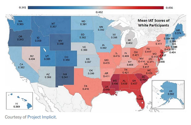 Based on this data, it appears that whites in some states may exhibit higher levels of implicit bias than those in other states. The following map, courtesy of Project Implicit, shows the states with the highest level of implicit bias (high number, red) and lowest level of implicit bias (low number, blue). Gray represents states with a middle amount of implicit bias; Michigan is the median state. Overall, the map reflects the scores of 1.51 million individuals, ranging from a high of 99,660 test takers from California to a low of 1,722 test takers from Hawaii.
