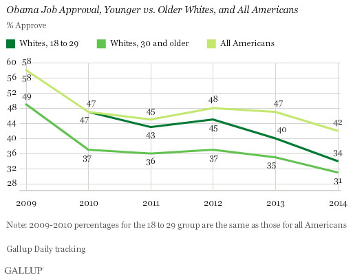 President Barack Obama’s job approval rating in 2014 among white 18- to 29-year-olds is 34%, three points higher than among whites aged 30 and older. This is the narrowest approval gap between the president’s previously strong support base of white millennials and older white Americans since Obama took office.