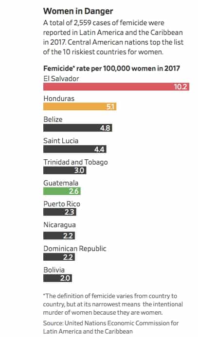 El Salvador, a tiny country of 6 million, has seen homicides of women more than double since 2013 to 469 last year. The death rate per 100,000 women, at 13.5, is more than six times that of the U.S., with Honduras and Guatemala close behind.