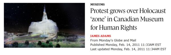 Only 18 percent of the floorspace has exhibits. I guess that’s why there was such a squabble among the victim groups, with some complaining that others were hogging the limelight. This gave rise to headlines such as “Competing Genocides,” and “Protest grows over Holocaust ‘zone’ in Canadian Museum for Human Rights.”