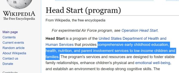 Take Head Start. As its Wikipedia page explains, it’s supposed to give “comprehensive early childhood education, health, nutrition, and parent involvement services to low-income children and families.”
